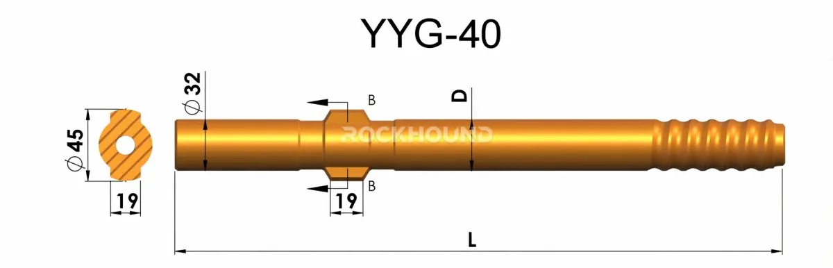The YYG40 shank adapter is the mechanical coupling component between a YYG40-class pneumatic rock drill and the drill rod string.It transmits both the percussive impact energy from the drill's piston and the rotational torque from the chuck to the drill rod and bit. It is a consumable item that must be periodically replaced due to thread wear and striking face fatigue.