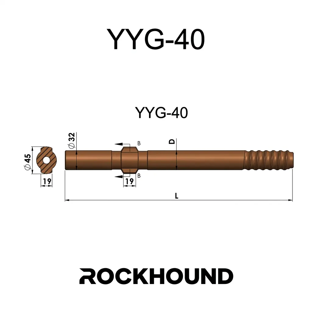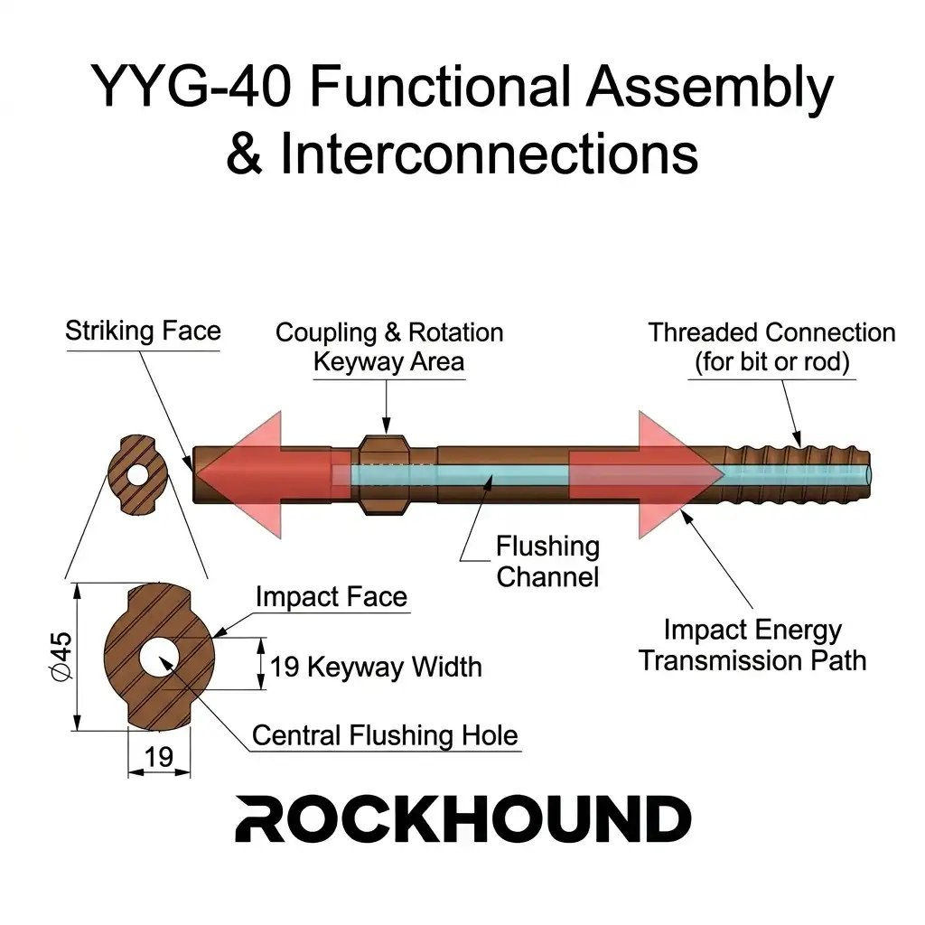 En YYG40 Adaptador de vástago — also referred to in field terminology as a striking bar o shank rod — is the primary mechanical interface between the pneumatic rock drill and the drill string. It receives direct piston impact, transmits percussive energy down the rod column to the drill bit, and simultaneously transfers rotational torque from the drill’s chuck bushing.